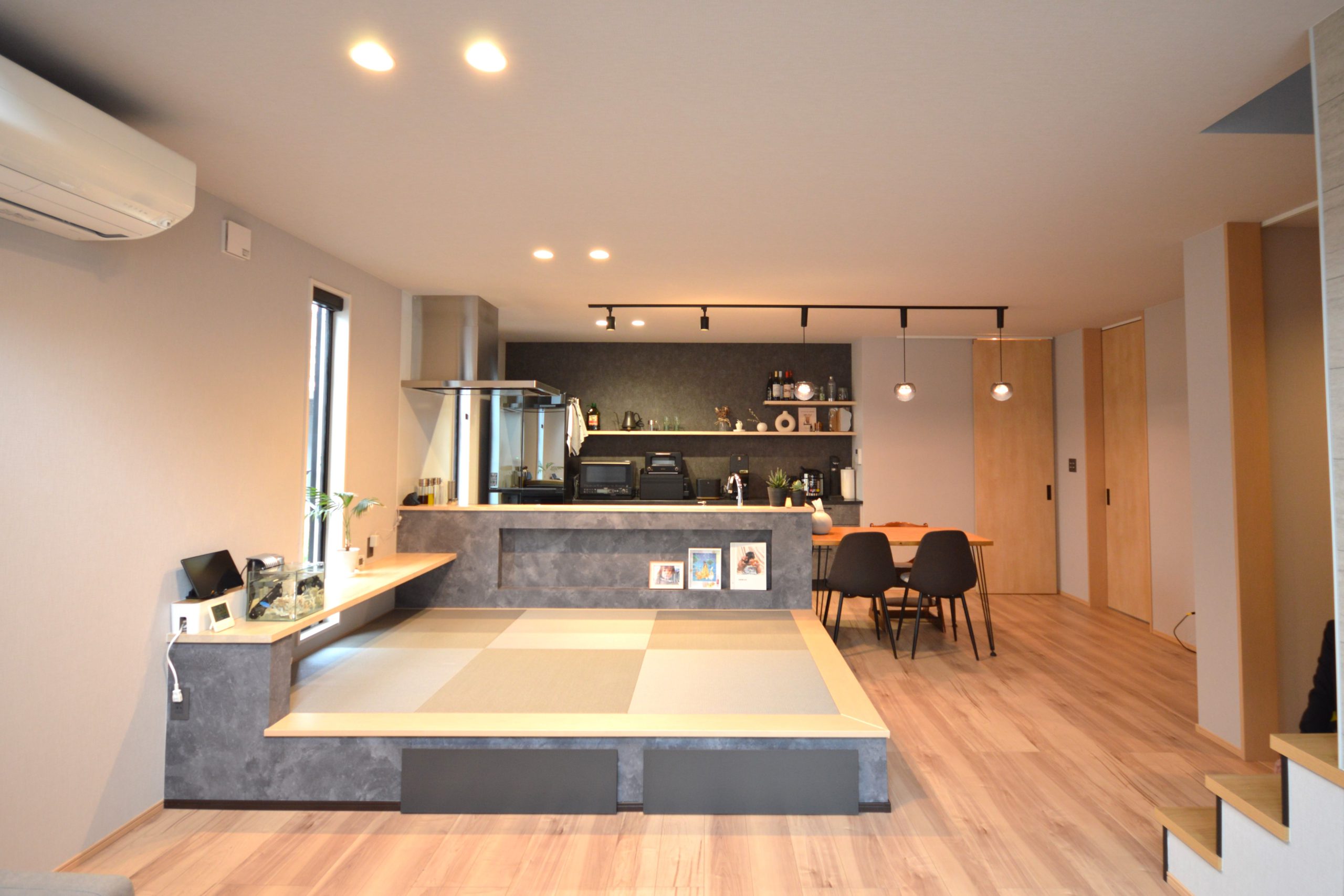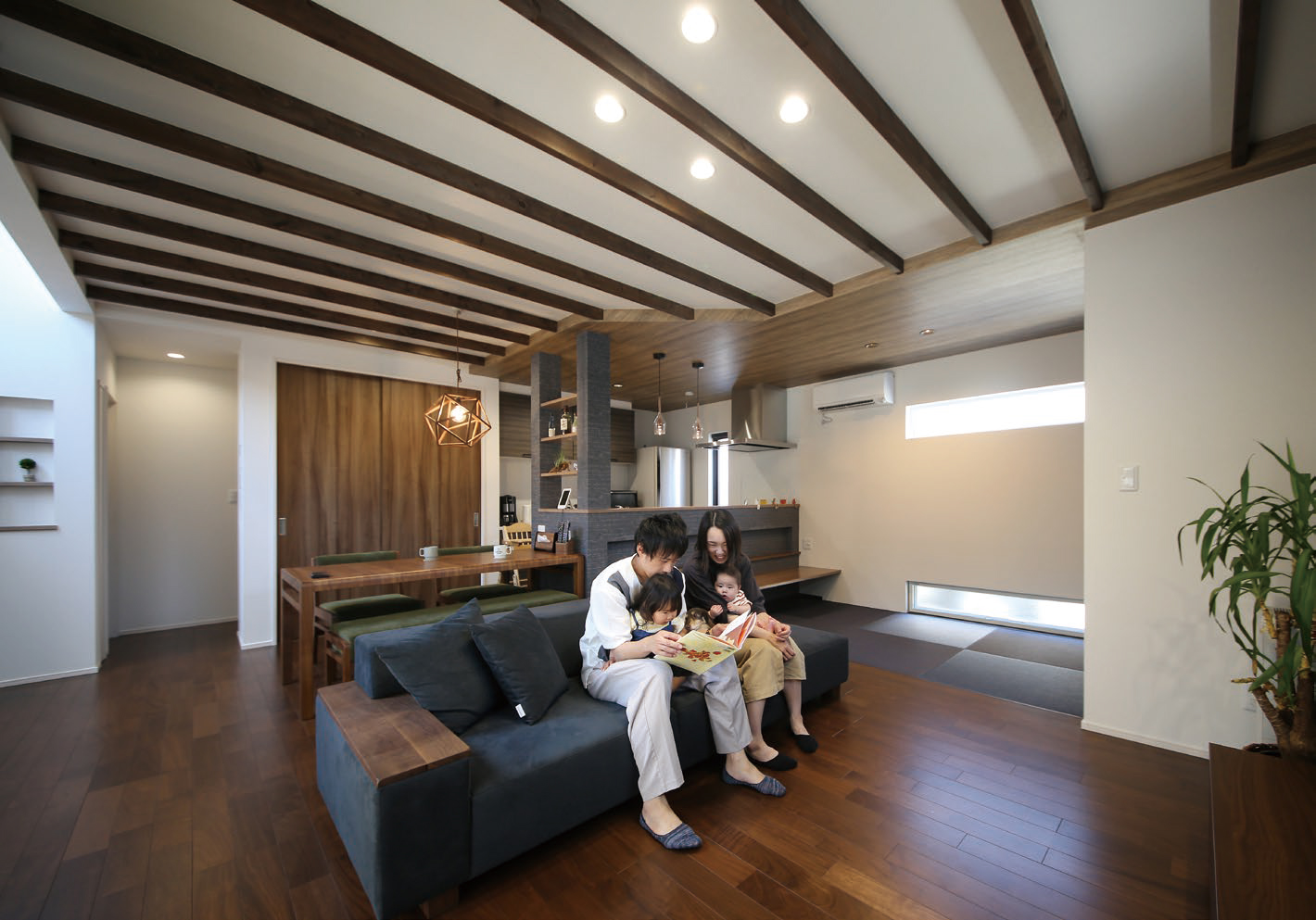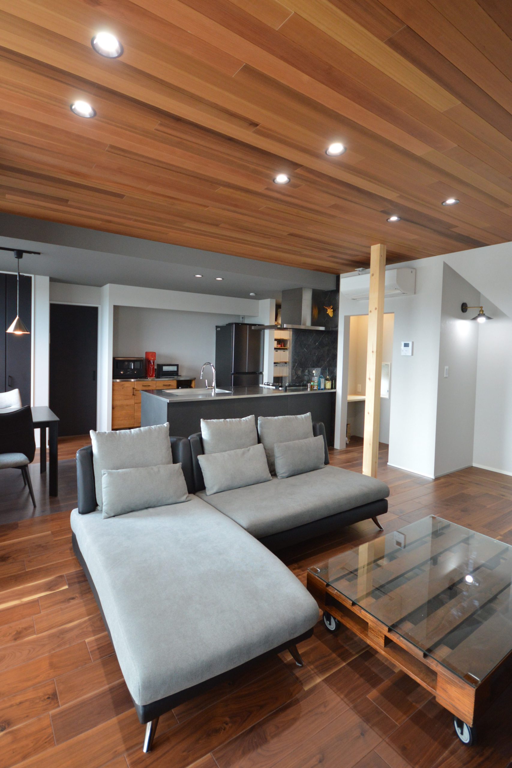 古材でヴィンテージ感を出したLDKで、常に家族の気…