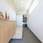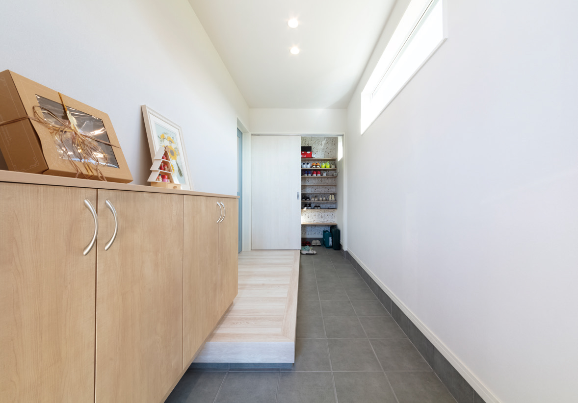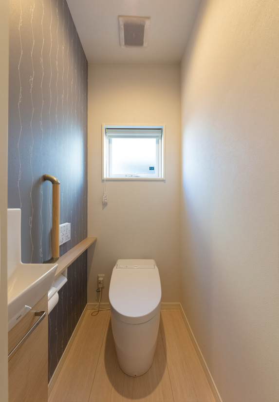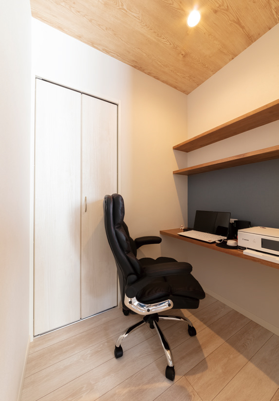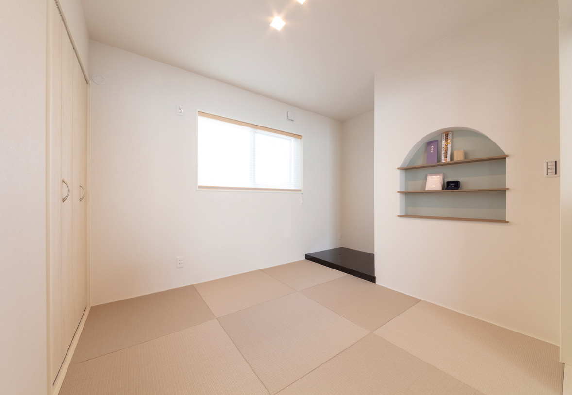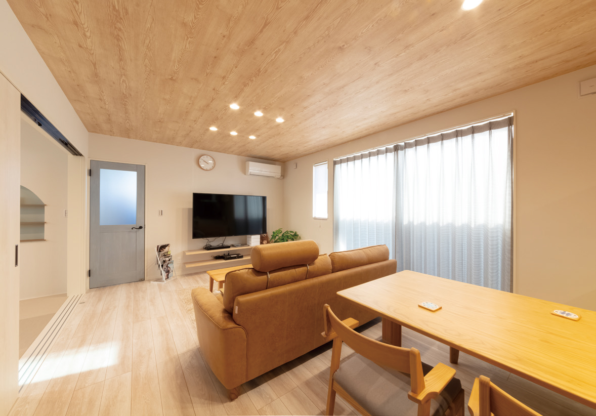 北欧風デザインをご要望とのことで、LDKは白と温かみのあるナチュラルカラーをベースに、単調にならないようペールブルーのドアや照明をアクセントにして飽きの来ないデザインを心がけました。和室は和テイストが強くなりすぎないように、アーチ型のニッチにアクセントカラーを使い、LDKと統一感を持たせました。