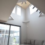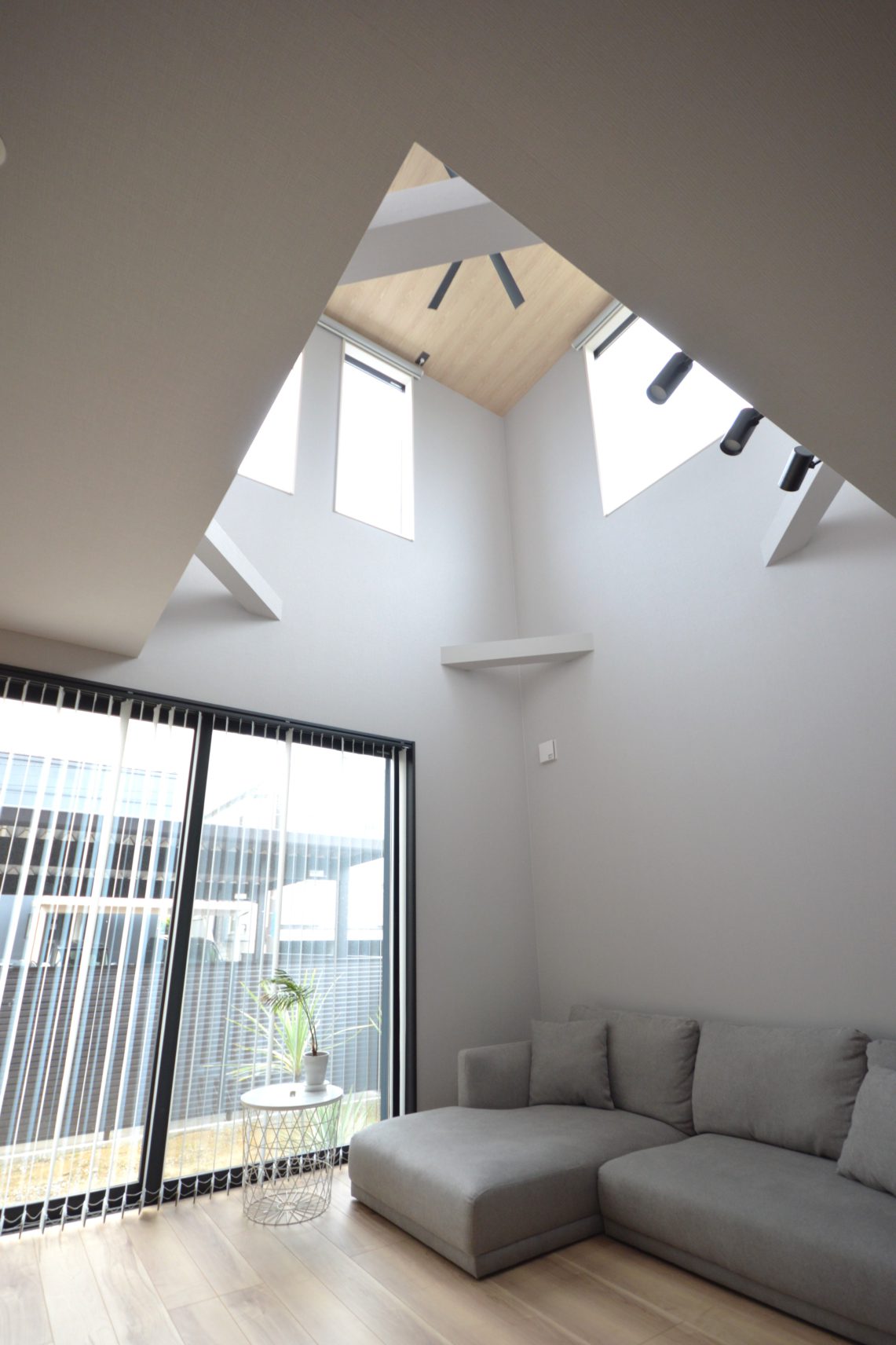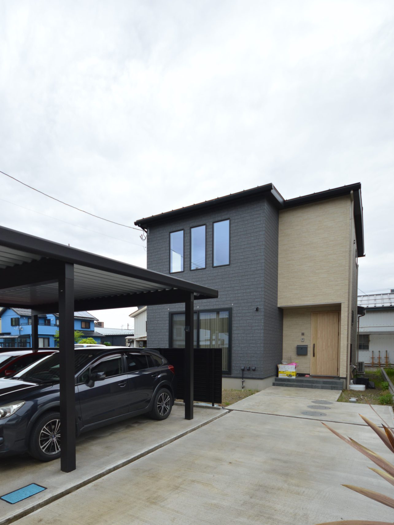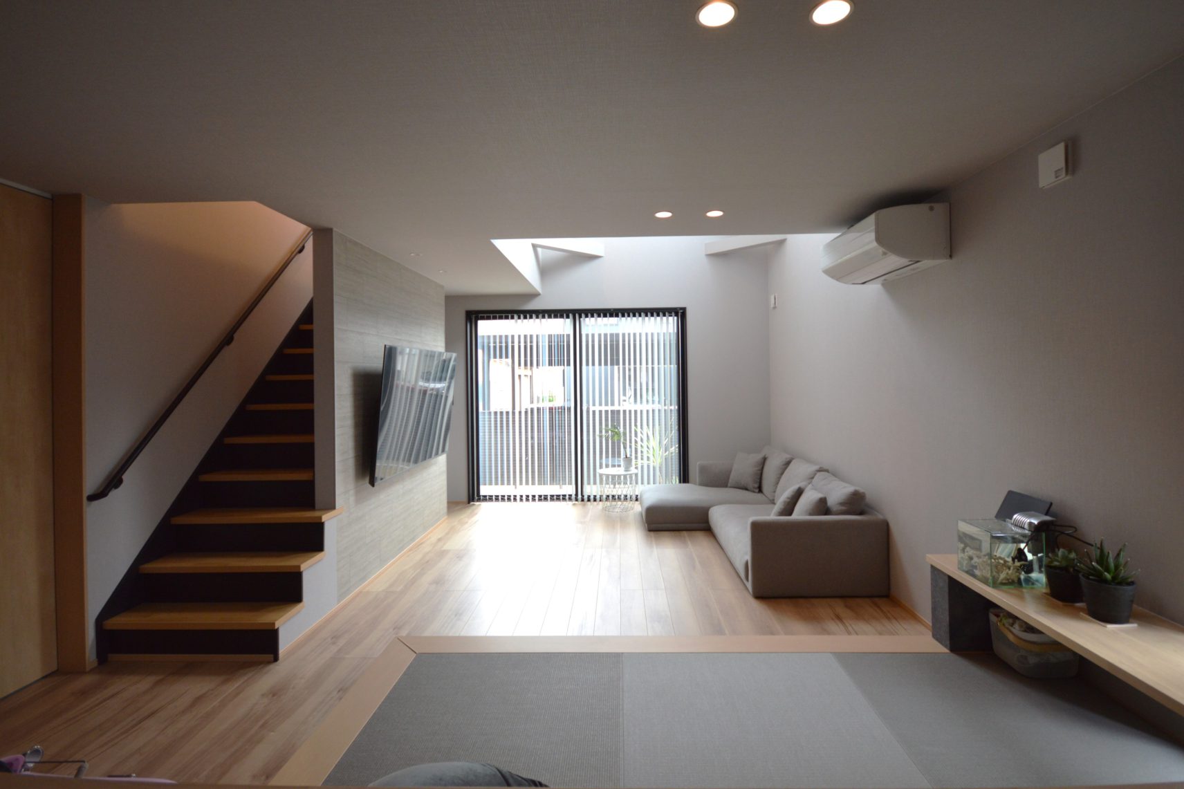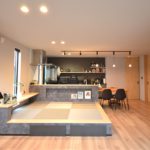 開放感のある吹き抜けと小上がりがご希望だったので、キッチンからそれらを全て見えるようにし、ご主人のただいま動線と、奥様の家事動線を意識して、縦長の敷地を活かしたプランをご提案しました。白いクロスを一切使わず、グレーとナチュラルな木目に黒のアクセントが映える上品な感じに仕上がり、ご夫婦のイメージピッタリです。