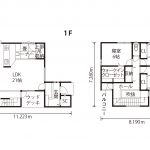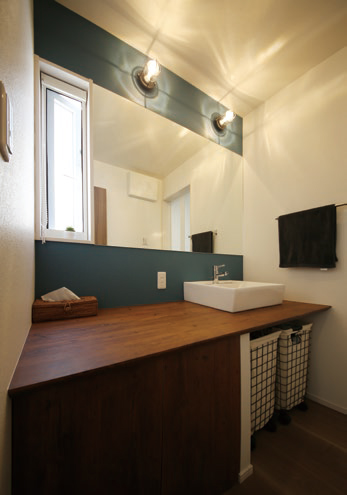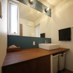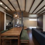 化粧梁をあしらって解放感を出したLDK、照明や色にこだわったダイニングキッチン、キッチンカウンターにはブロック風のクロスをチョイスして、ブルックリンスタイルのカフェ風に仕上がりました。 キッチン裏にある水まわりを一直線にまとめて家事動線もよく考えられています。