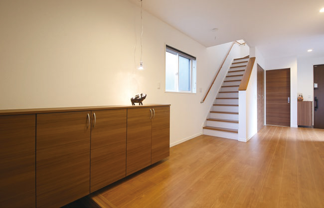 「開放感のある住まいでのびのびと過ごされたい」というご要望を踏まえ、2階リビングのデザイン住宅を提案させて頂きました。造作の洗面台やお子様の身長が測れる壁紙、間接照明など細かいところにまでこだわり、素敵な住まいになりました。
