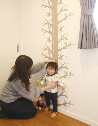 こちらの好みに合わせて壁紙や照明の提案して頂いたので、満足感の高いデザインになりました。子供の身長が測れる壁紙は、家族の大切な思い出になりそうです。