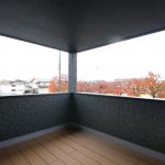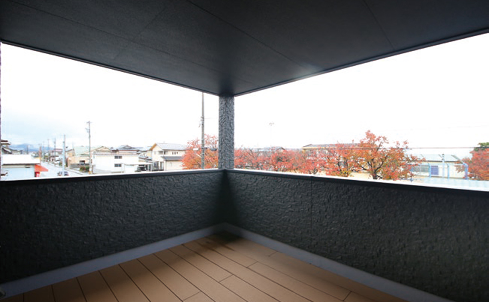 屋根付きのテラスです。休日に外へ出かけなくても、家でゆっくり過ごせるのがいいですね。夏はここで子供とプール遊びがしたいです。