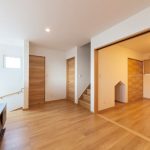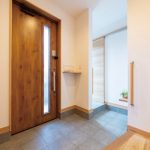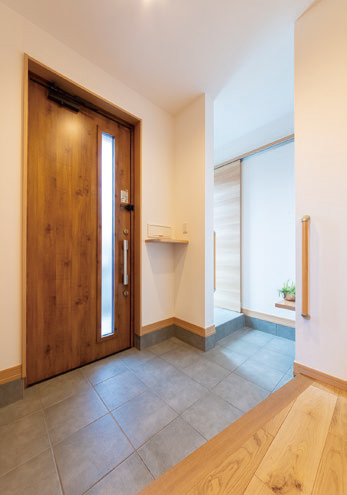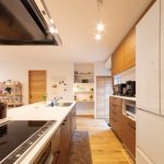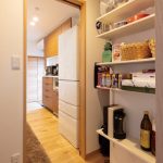 奥様キッチン横のパントリーは玄関にも近く、買い物後の収納も楽チンです。ワンちゃんが走り回っても滑らないようにムク材のフローリング床にしました。