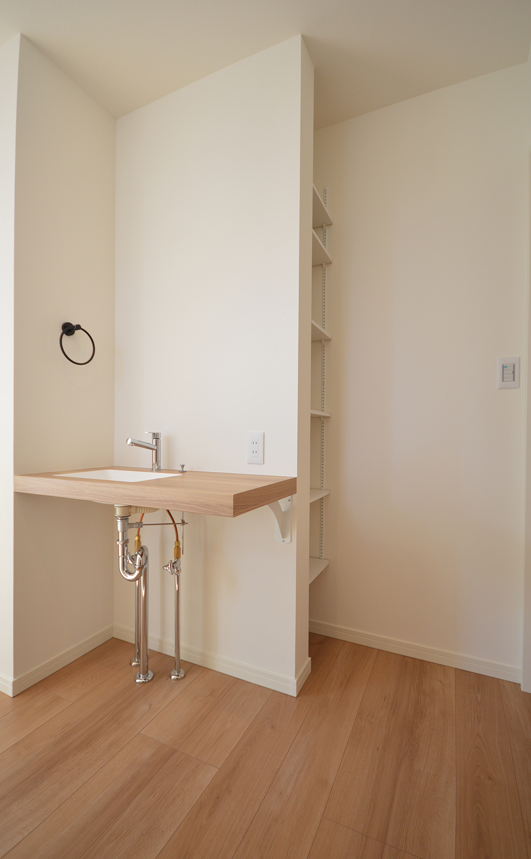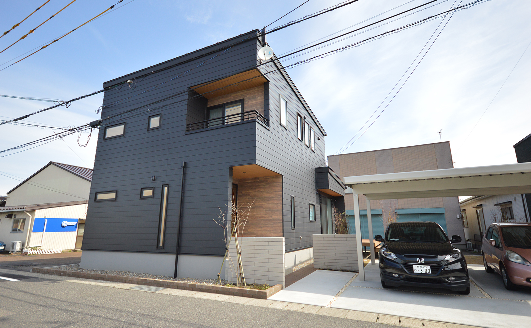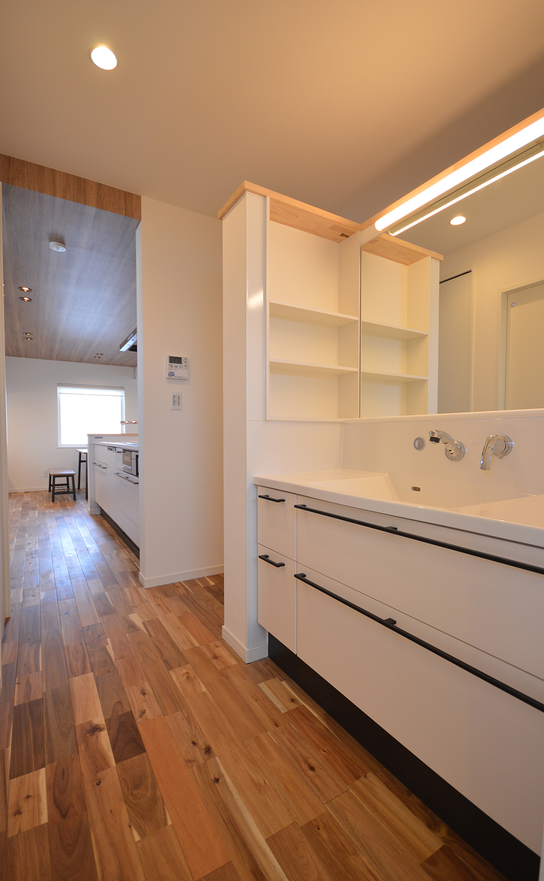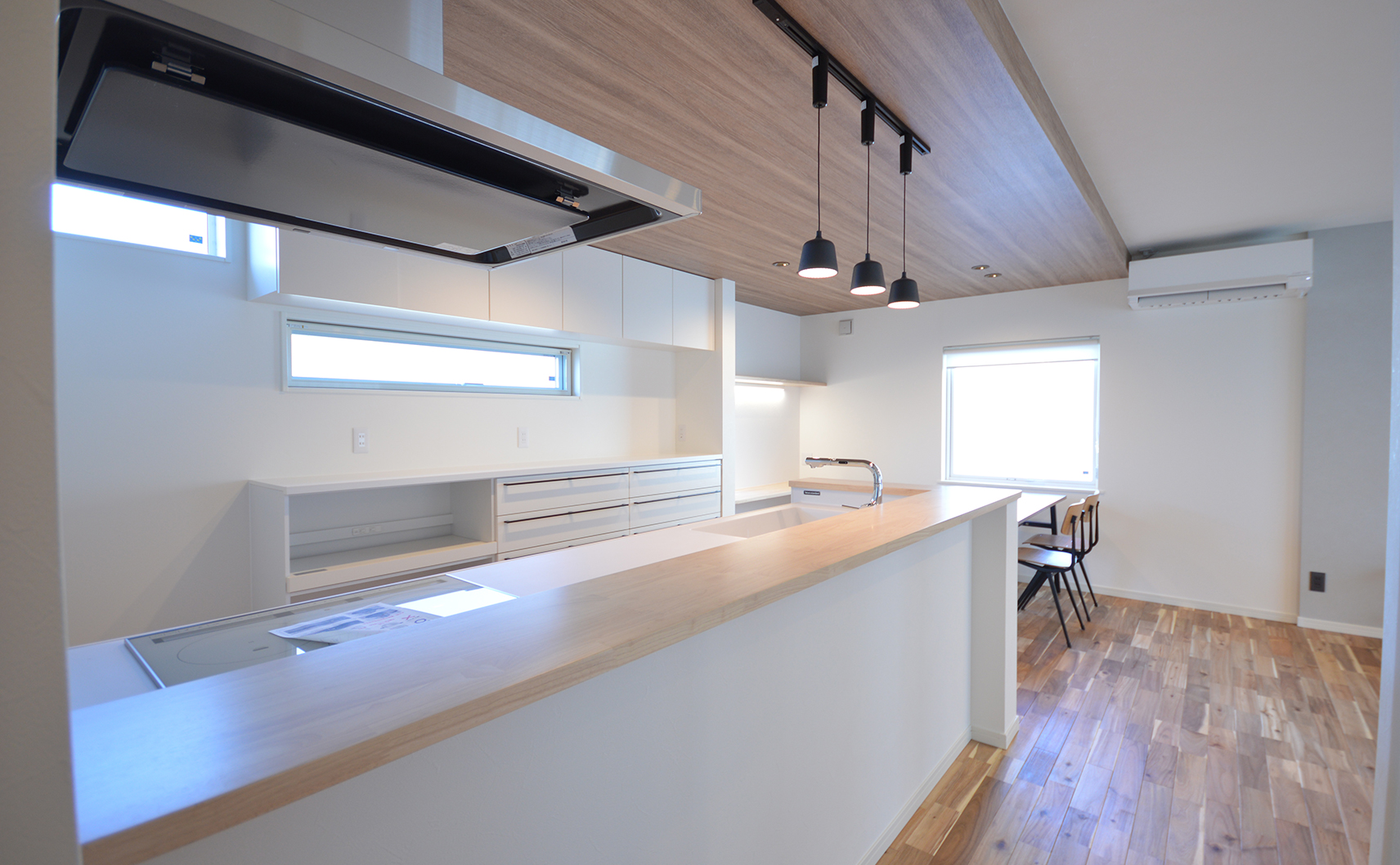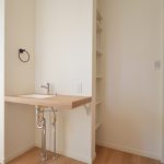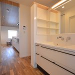 K様とは建築に対する考え方やデザインの好みが私と似ていて、終始楽しく打ち合わせをさせていただきました。金属サイディングのスタイリッシュな外観とは正反対に、内装は無垢の床を使用したナチュラルな雰囲気で2面性のあるお家に。LDKの死角に洗面スペースや水周りを設けることで1階が1つの空間で繋がり、夏も冬も快適に過ごせる空間になりました。